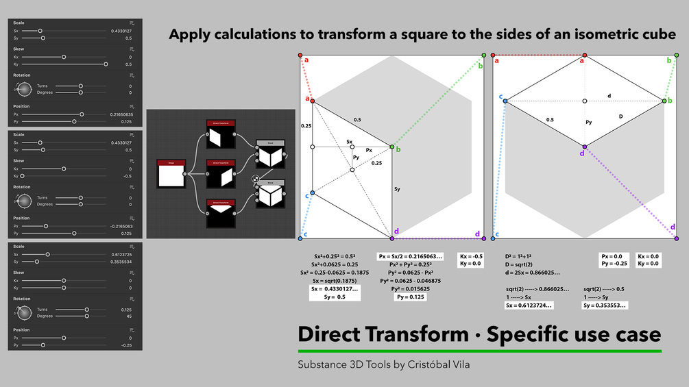 This Direct Transform node, instead, converts input values for Scale, Skew and Rotation to a 2×2 matrix, to be used by an internal Transformation 2D, allowing an “absolute” control for these channels.