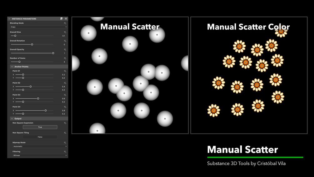 Note that this product really include 4 nodes: Manual Scatter (Grayscale and Color) and Manual Scatter Pro (Grayscale and Color)