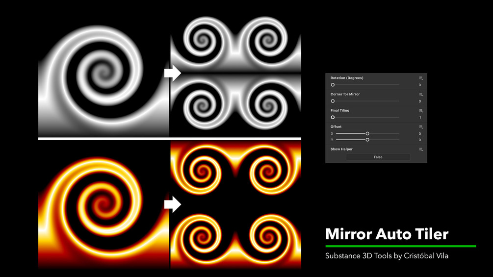 Normally we should use a combination of Mirror, Transformation 2D and Blends nodes. But with this node we have it in one go, and also with the possibility of controlling the Initial Rotation and the Corner used for the Mirror.