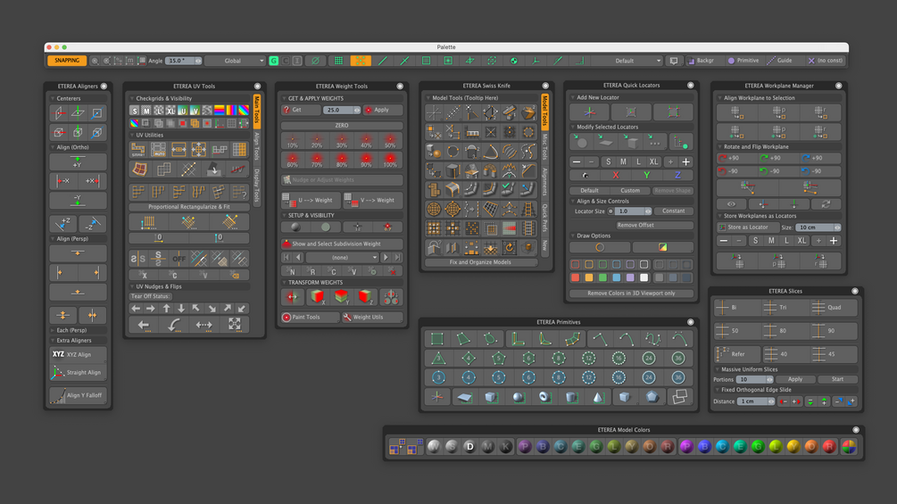 These kits for Modo were originally created and/or compiled by Cristóbal Vila. In several cases they incorporate scripts made by different Modo users that they themselves shared in the official forum of the Modo app, and would have disappeared in the depths of the underworld if they had not been compiled and assigned a friendly interface, with buttons, icons, palettes, etc.