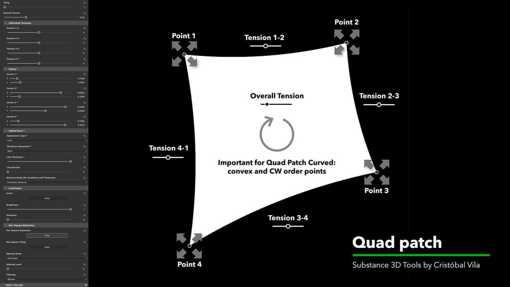 With this node you can create a free quad, both with straight or curved sides (using a quadratic bezier). User can freely place the 4 points, but it’s important to create “convex” figures and follow a CW order for points.