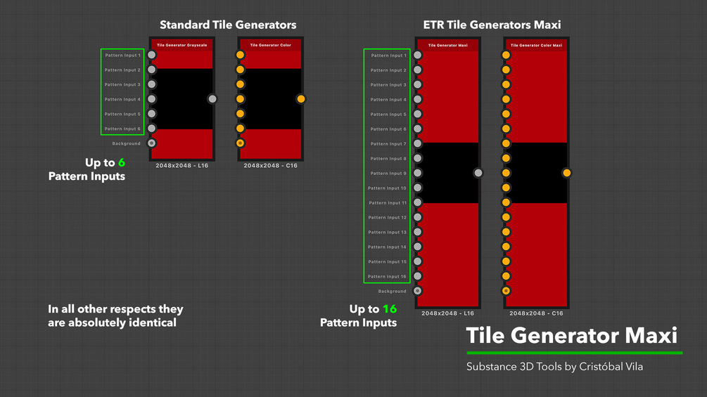 Custom Tile Generator with up to 16 input patterns, instead of only 6. In all other respects this node is identical to the Tile Generator that comes with Designer.